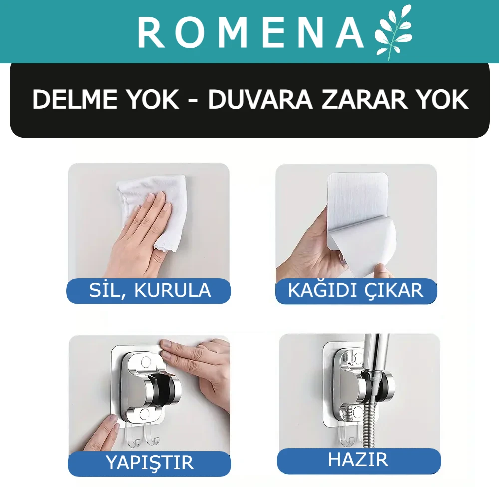 Romena RM-5030 krom el duşu tutacağı, kendinden yapışkanlı yapısı sayesinde duvar delmeden kolay montaj imkânı sunar. Parlak krom yüzeyi ile banyolara temiz, modern ve hijyenik bir görünüm kazandırır.