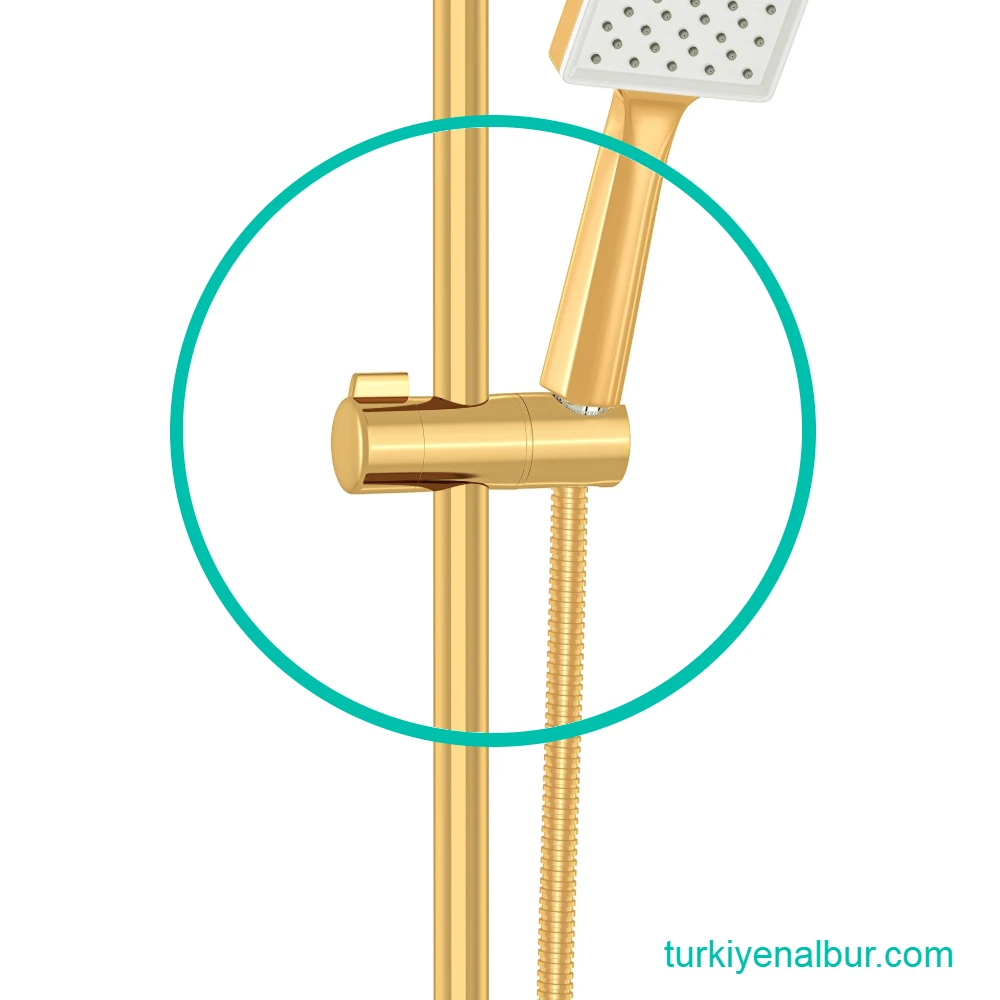 Valtemo VS-170 Brushed Mat Gold Slider – Mafsal, el duşunu duş seti borusu üzerinde yukarı-aşağı hareket ettirerek istenilen yükseklikte konumlandırmaya imkân tanır. Mafsallı yapısı, duş başlığının açısını kullanıcıya göre ayarlamayı kolaylaştırarak daha konforlu bir duş deneyimi sunar.