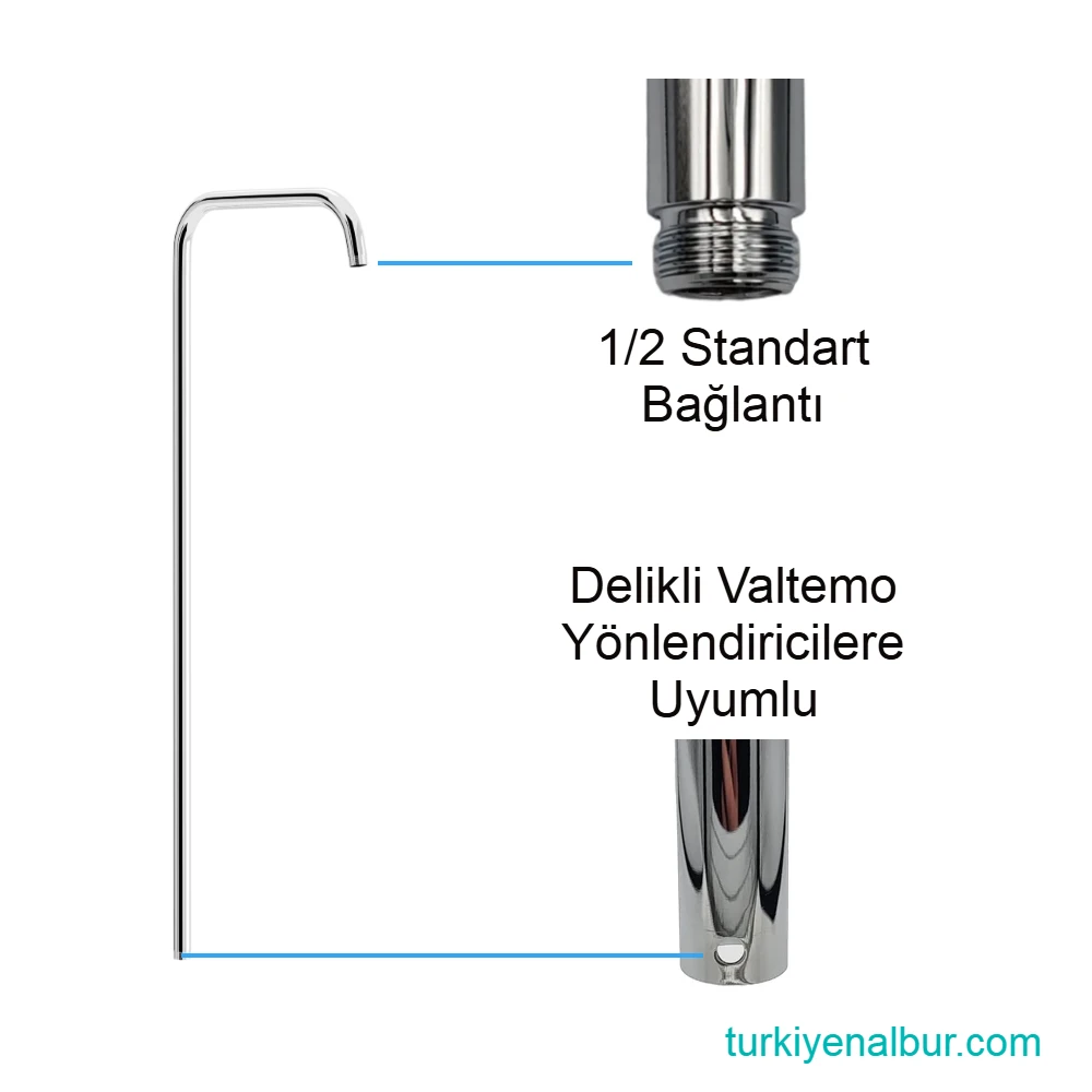 Bu borunun üst kısmı yaygın standart ölçü olan  1/2″ ve dıştan dişlidir. Alt kısım ise yönlendiriciye geçme olarak takılır. Dişli değildir. Valtemo yönlendiriciler ile uyumludur.