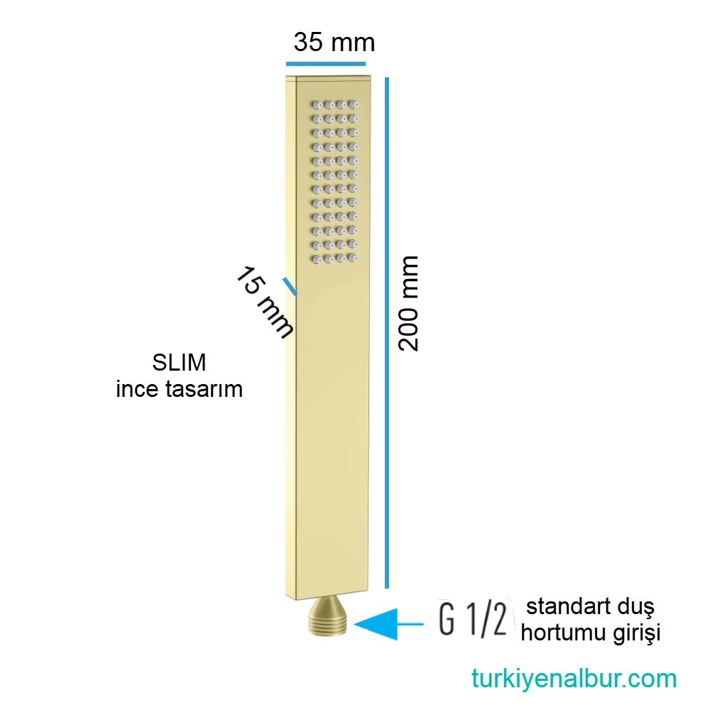 Valtemo Fineart Shiny Gold El Duşu VS-9015, modern banyo tasarımlarına uyum sağlayan slim dikdörtgen formu ve parlak altın görünümüyle dikkat çeker. Full pirinç metal gövdesi sayesinde paslanmaz, uzun ömürlü ve kaliteli bir kullanım sunar.