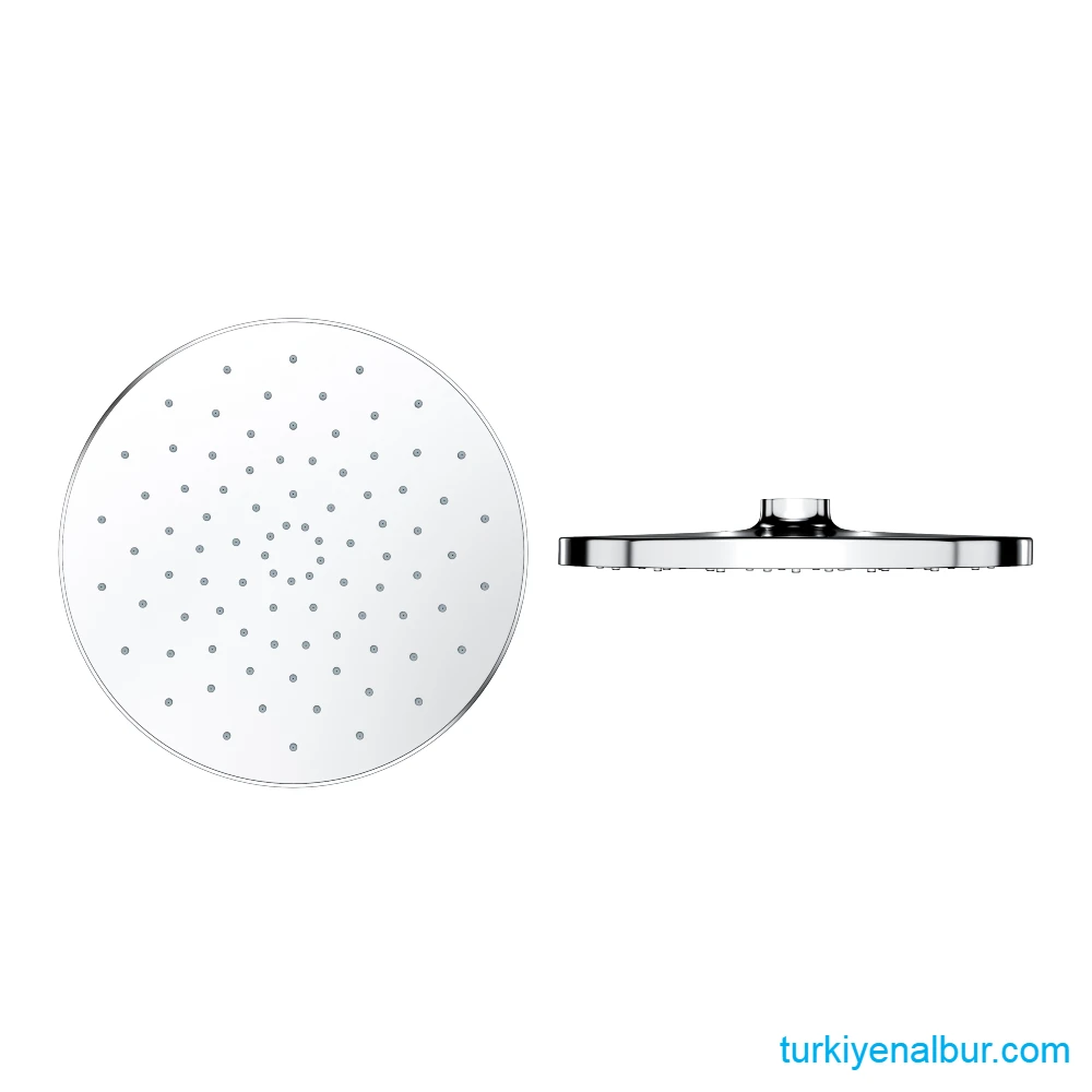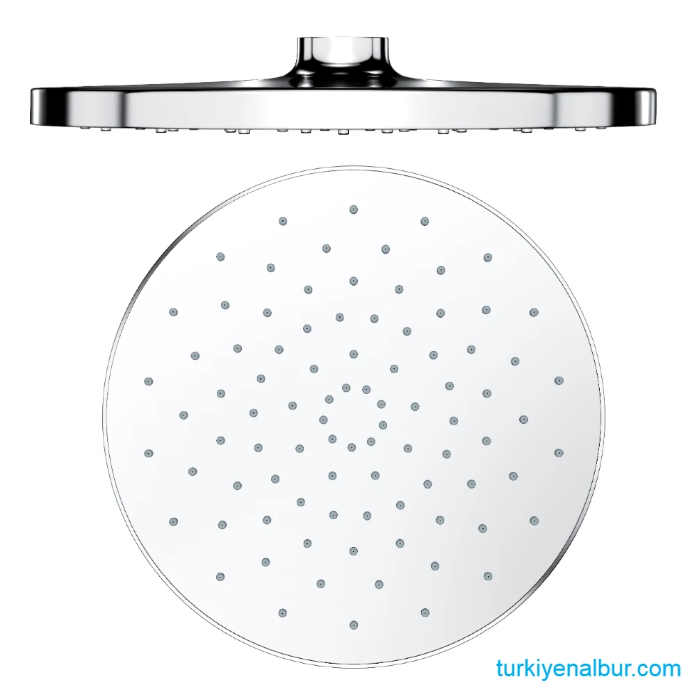 • Yuvarlak formu ve sade krom görünümü sayesinde hem modern hem de klasik banyo tasarımlarına uyum sağlar. Geniş duş yüzeyi, banyoda daha dengeli ve kapsayıcı bir su dağılımı isteyen kullanıcılar için avantaj sunar. Bu yapısı sayesinde ürün, günlük kullanımda daha konforlu bir duş hissi oluşturmaya yardımcı olur.