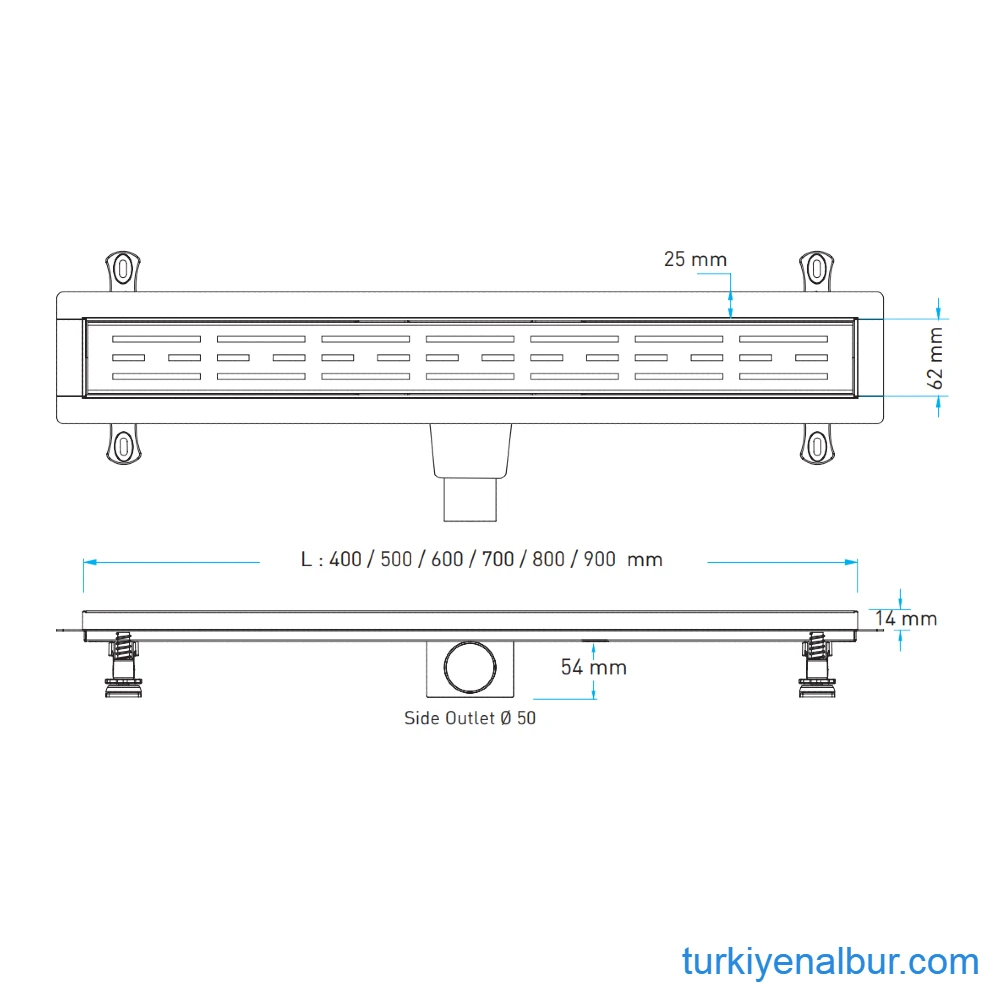 60 cm uzunluğu sayesinde orta ölçülü duş alanlarında dengeli kullanım sunan bu model, suyun kontrollü ve hızlı şekilde tahliye edilmesine yardımcı olur. AISI 304 paslanmaz çelik ızgarası uzun ömürlü kullanım avantajı sağlarken, sağlam gövde yapısı günlük kullanıma uygun bir yapı sunar.