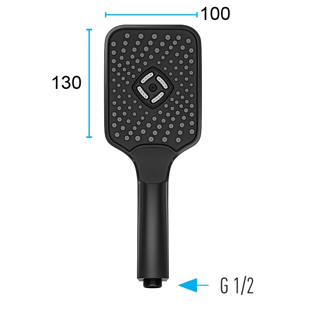 • 100×130 mm ölçülerinde büyük boy, 3 fonksiyonlu, butonlu el duşu başlığı (Rain, Massage, Jet).