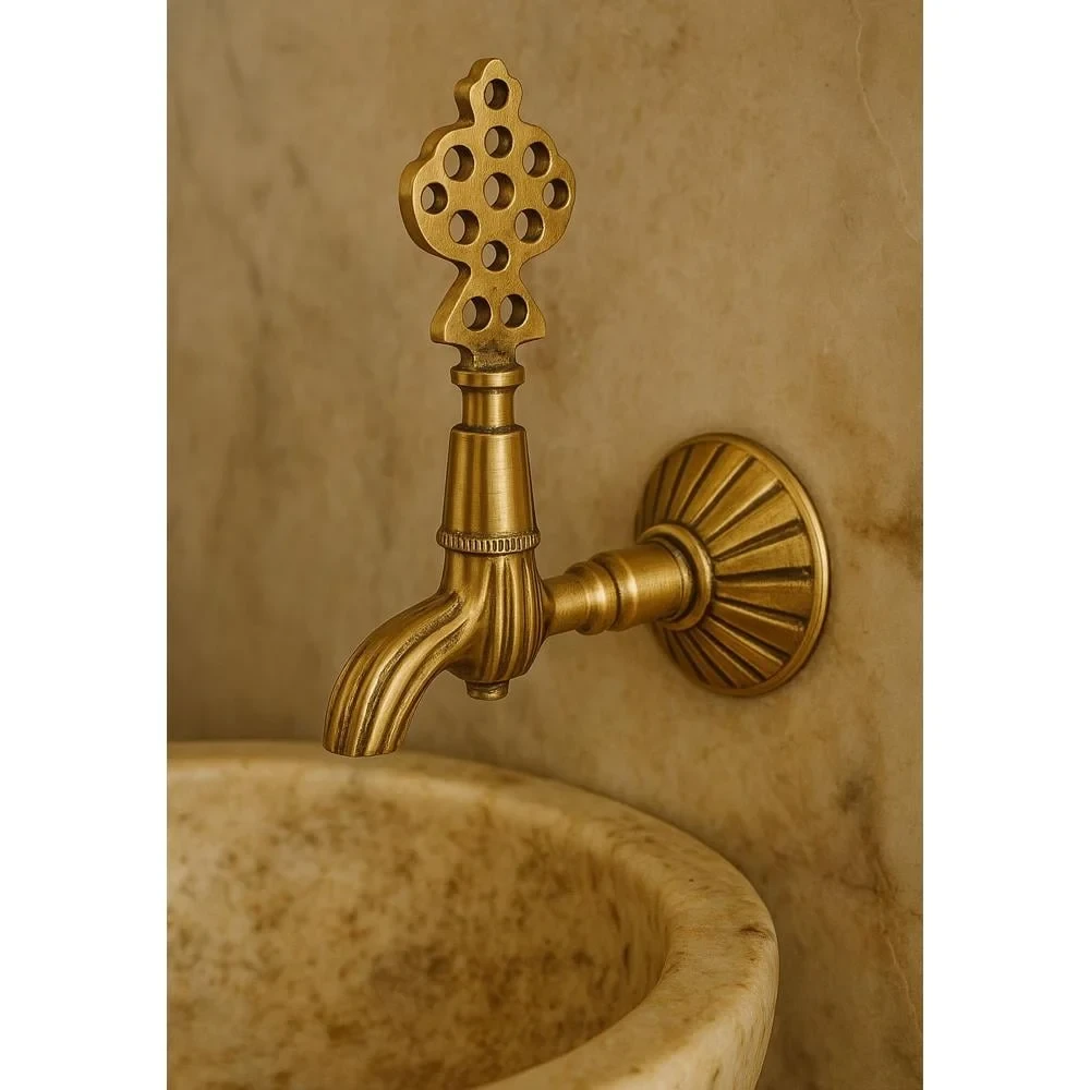 Tamamı pirinç malzemeden üretilmiş olan bu özel musluk, uzun ömürlü kullanım sunar. Antik görünümlü yüzeyi sayesinde hamamlar, bahçeler, camiler, taş lavabolar ve konsept dekorasyon projelerinde sıkça tercih edilir.